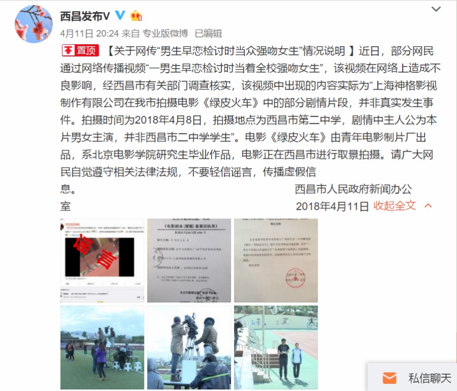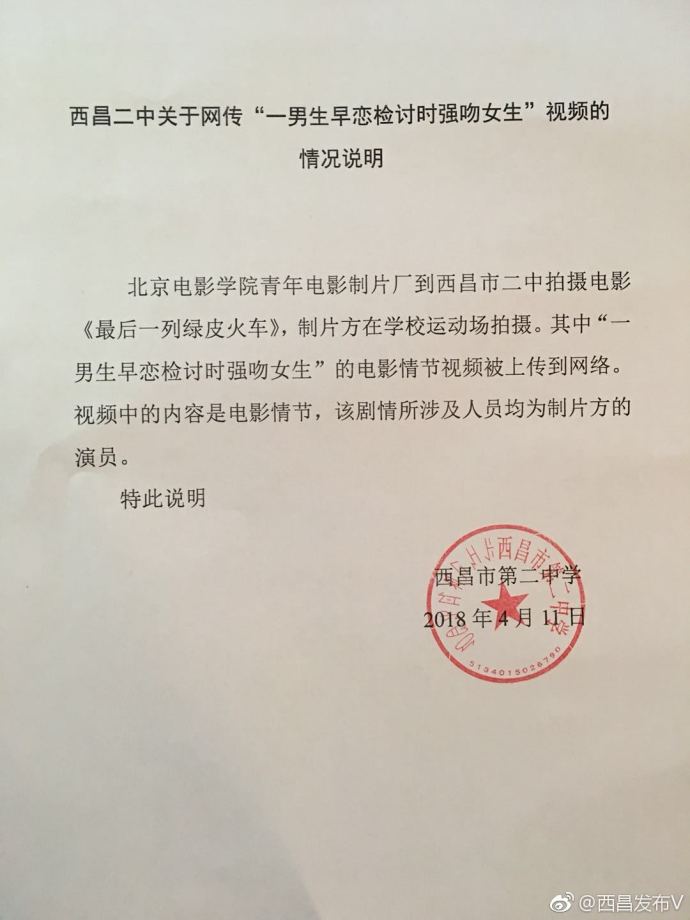 4月11日,西昌市政府新聞辦官微“西昌發(fā)布”發(fā)表對該視頻的情況說明。經(jīng)查,該視頻中出現(xiàn)的內容實際為“上海一影視制作有限公司在西昌市拍攝某電影中的部分劇情片段,并非真實發(fā)生事件。拍攝時間為2018年4月8日,拍攝地點為西昌市第二中學,劇情中主人公為本片男女主演,并非西昌市二中學學生”。并附圖“北京市新聞出版廣電局《電影劇本〈梗概〉備案回執(zhí)單》”、“西昌二中關于網(wǎng)傳‘一早戀男生檢討時強吻女生’視頻的情況說明”及在操場取景拍攝的照片。