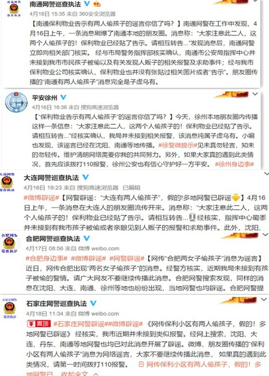 4月16日至18日,又有南通、徐州、大連、合肥、石家莊等地熱傳同樣的“兩女子偷孩子”照片,當?shù)鼐骄鶎Υ吮僦{。