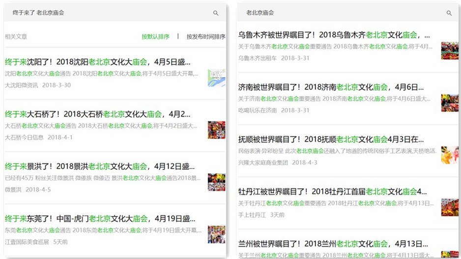 此類消息打出“高品質(zhì)的游玩盛會(huì)、高規(guī)格的城市經(jīng)典”的噱頭,聲稱“廟會(huì)門票免費(fèi)送”,呼吁大家“隨手一曬到盆友圈,讓更多的人知道”,并且介紹了舞獅舞龍、二人轉(zhuǎn)、踩高蹺、民俗手工藝等等的廟會(huì)活動(dòng),鋪排了大量的美食照片,達(dá)到博人眼球的效果。