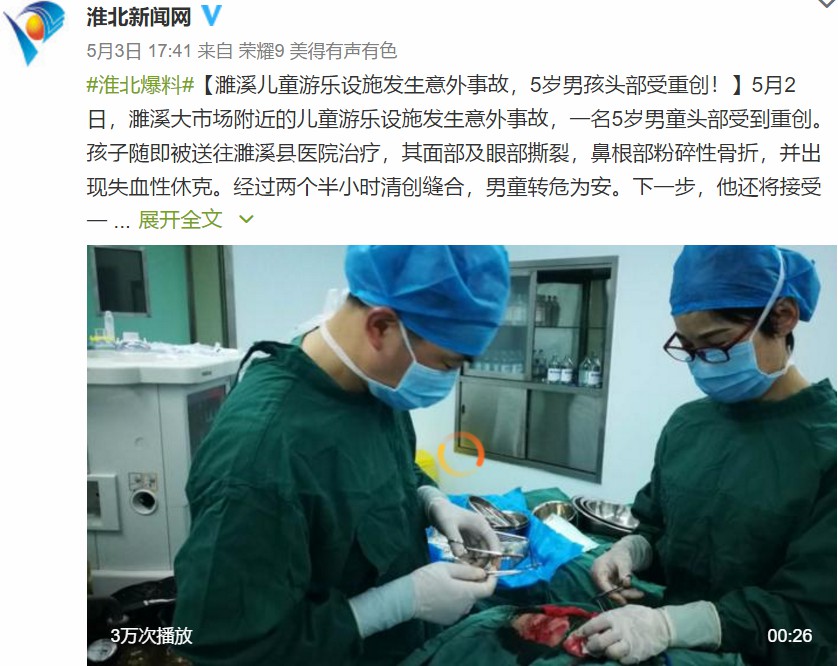 人民網(wǎng)北京5月8日電(孝金波、楊思萱)近日,一段“男童在游樂場發(fā)生意外事故”的視頻備受關(guān)注,許多網(wǎng)民惋惜轉(zhuǎn)發(fā),但在傳播中,事件發(fā)生地被誤冠以多個城市游樂場。經(jīng)查,這其實(shí)是5月2日安徽淮北發(fā)生的,男孩頭部多處撕裂骨折,但經(jīng)過治療后脫離了生命危險(xiǎn)。