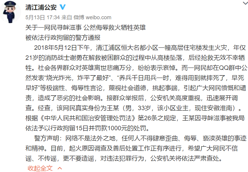 清江浦警方聲明:網(wǎng)絡(luò)不是法外之地,任何人不得肆意歪曲、侮辱、褻瀆英雄的事跡和精神。目前,起火原因調(diào)查及善后處置工作正有序進(jìn)行,希望廣大網(wǎng)民不信謠、不傳謠,更不要造謠,對違法犯罪行為,公安機(jī)關(guān)將依法嚴(yán)肅查處。