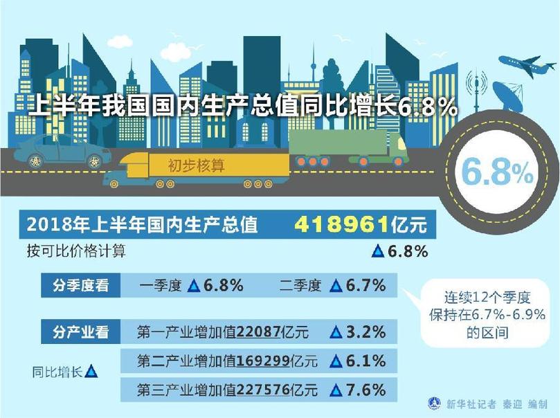 新華社北京7月16日電(記者陳煒偉、安蓓)國(guó)家統(tǒng)計(jì)局16日發(fā)布數(shù)據(jù),初步核算,上半年國(guó)內(nèi)生產(chǎn)總值418961億元,按可比價(jià)格計(jì)算,同比增長(zhǎng)6.8%。分季度看,一季度同比增長(zhǎng)6.8%,二季度增長(zhǎng)6.7%,連續(xù)12個(gè)季度保持在6.7%至6.9%的區(qū)間。
