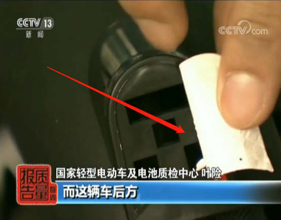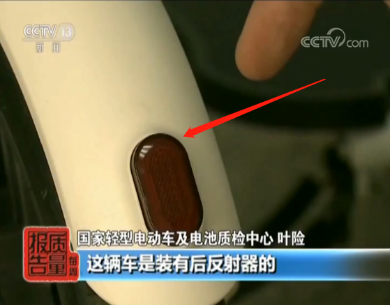 國家輕型電動車及電池質檢中心 葉險:我們可以看到這輛車,這輛車是裝有后反射器的,所以它可以使得后方的機動車發(fā)現(xiàn)它。而這輛車它后方其實是沒有反射器的,我們看這個好像是疑似反射器,但它僅僅只是一張貼紙,我們一次就可以把它撕下來,它是起不到任何反射作用。所以這輛車的話,是沒有保證它的騎行者的安全的。