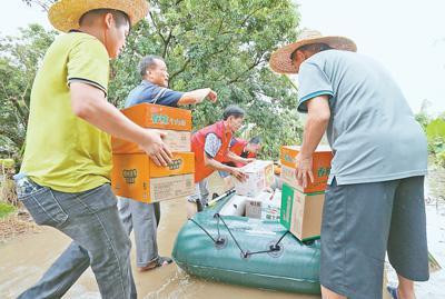9月18日,在廣東省陽江市陽春市,工作人員把食物搬運到筏子上,準備分發(fā)給受困村民。目前,陽江市正在開展救災重建工作。