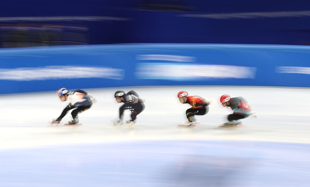 10月22日,選手在首都體育館參加2021-2022國(guó)際滑聯(lián)短道速滑世界杯北京站比賽。新華社記者曹燦攝