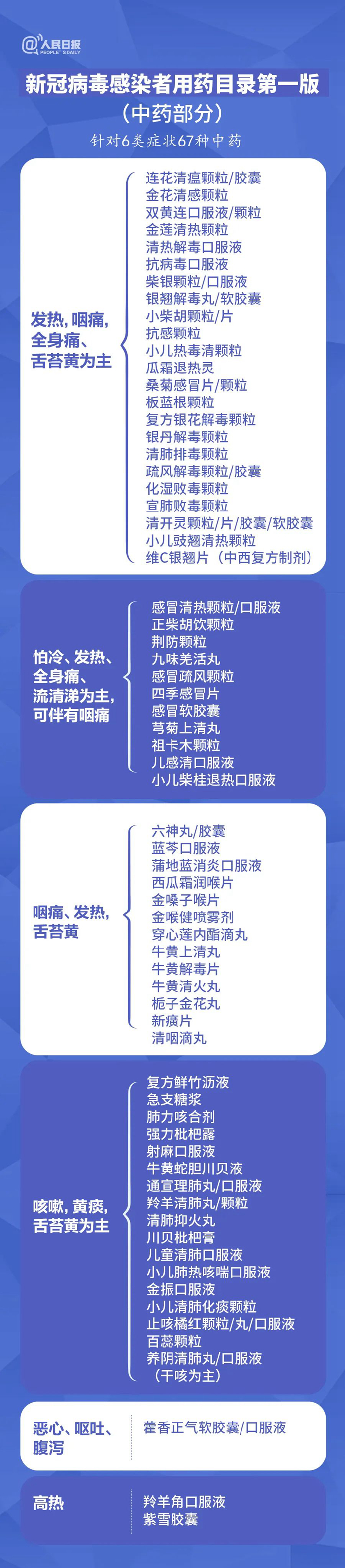 此版用藥目錄按照中西藥分開的原則,是對國家第九版診療方案中推薦用藥的完善和補(bǔ)充,針對發(fā)熱、咽痛等6類中醫(yī)診斷癥狀推薦67個(gè)中藥品種;針對咳嗽、咳痰等4類臨床癥狀推薦41個(gè)西藥品種。