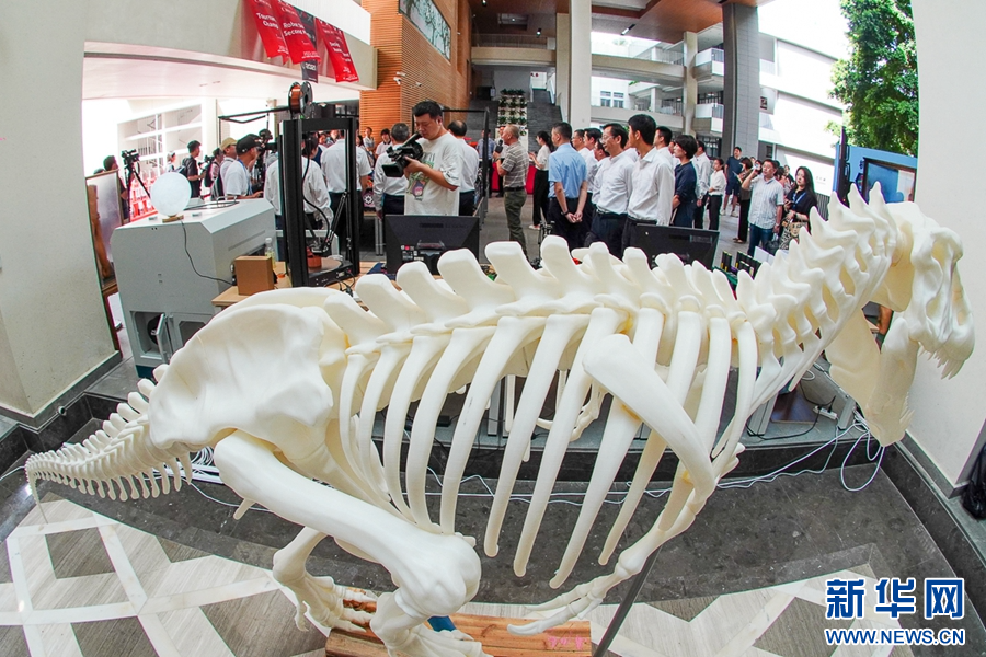 9月12日,福州第三中學(xué),師生用3D打印技術(shù)制造的霸王龍骨骼模型展示。新華網(wǎng) 肖和勇 攝