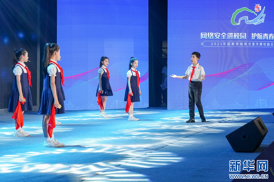 9月12日,校園日活動(dòng)啟動(dòng)儀式上,學(xué)生表演“文明凈網(wǎng)”主題音樂快板節(jié)目。新華網(wǎng) 肖和勇 攝