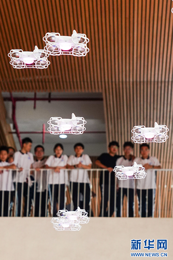 9月12日,福州第三中學(xué),師生操作無人機(jī)進(jìn)行編隊(duì)飛行表演。新華網(wǎng) 肖和勇 攝