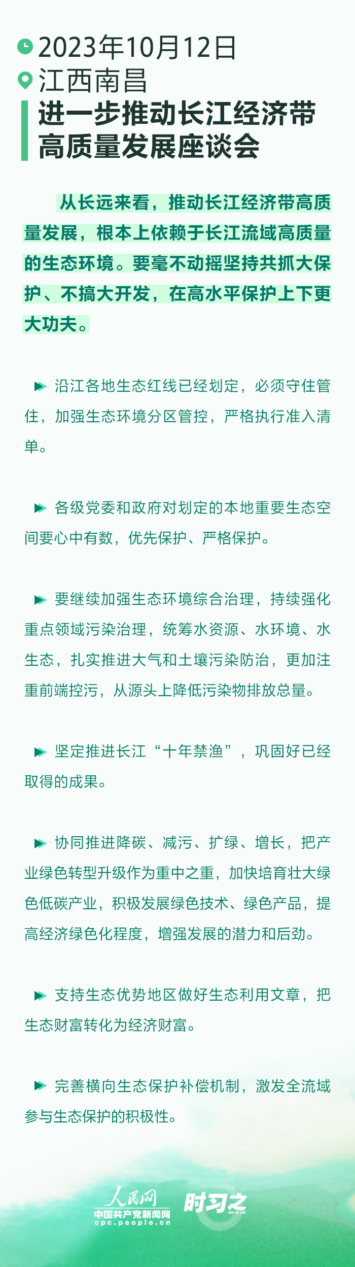 10月12日下午,習(xí)近平總書記在江西省南昌市主持召開進一步推動長江經(jīng)濟帶高質(zhì)量發(fā)展座談會并發(fā)表重要講話。座談會上,總書記指出,從長遠來看,推動長江經(jīng)濟帶高質(zhì)量發(fā)展,根本上依賴于長江流域高質(zhì)量的生態(tài)環(huán)境。