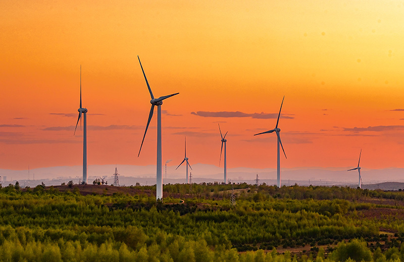 2023年5月23日清晨拍攝的內(nèi)蒙古興安盟烏蘭浩特市呼和馬場(chǎng)風(fēng)力光伏發(fā)電場(chǎng)內(nèi)的風(fēng)機(jī)。