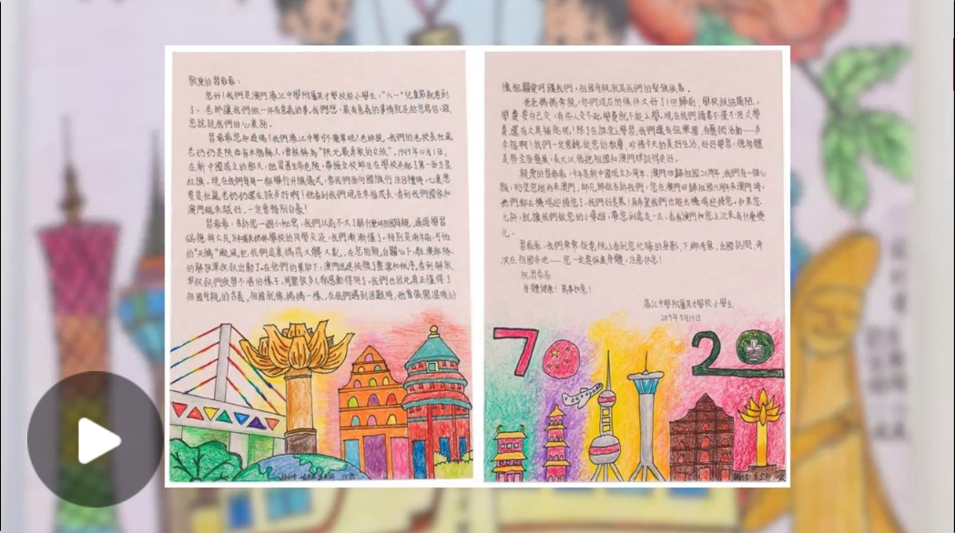 1949年10月1日,新中國成立當(dāng)天,老校長杜嵐帶領(lǐng)師生毅然升起澳門第一面五星紅旗。2019年,“六一”國際兒童節(jié)前夕,濠江中學(xué)附屬英才學(xué)校的小學(xué)生們主動提出想給“敬愛的習(xí)爺爺”寫封信,并附上生動的彩筆畫。