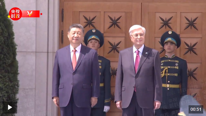 習(xí)近平抵達(dá)阿斯塔納納扎爾巴耶夫國際機(jī)場時(shí),托卡耶夫總統(tǒng)率總統(tǒng)辦公廳主任達(dá)杰拜、副總理兼外長努爾特列烏、總統(tǒng)外事顧問卡濟(jì)漢、阿斯塔納市長卡瑟姆別克等高級(jí)官員熱情迎接。身著盛裝的哈薩克斯坦女青年向習(xí)近平獻(xiàn)花。禮兵分列藍(lán)地毯兩側(cè)致敬,哈薩克斯坦少年兒童手持中哈兩國國旗熱烈歡迎習(xí)近平到訪。習(xí)近平在托卡耶夫陪同下觀看儀仗隊(duì)分列式,直升機(jī)懸掛中哈國旗從機(jī)場上空飛過。在機(jī)場貴賓樓內(nèi),兩國元首還共同欣賞哈薩克斯坦少年兒童的文藝表演。
