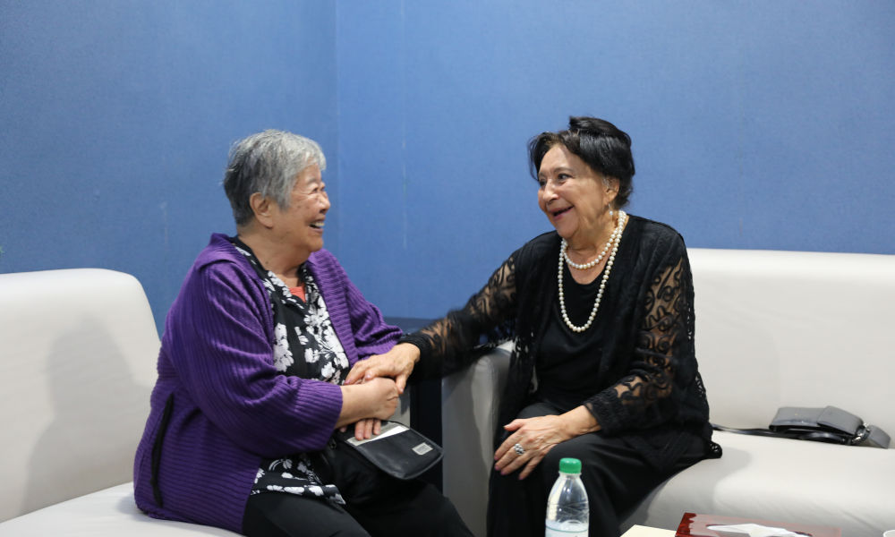 2024年10月9日,“人民音樂家”冼星海之女冼妮娜(左)和哈薩克斯坦音樂家拜卡達(dá)莫夫之女拜卡達(dá)莫娃闊別5年后在武漢約見。新華社發(fā)(劉天一攝)
