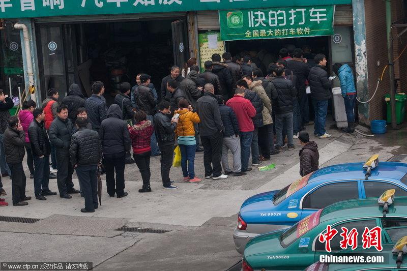 2014年2月19日,杭州“快的打車”服務(wù)點(diǎn),出租車司機(jī)們排隊(duì)安裝軟件。圖片來(lái)源:CFP視覺(jué)中國(guó)5kE安康新聞網(wǎng) 5kE安康新聞網(wǎng)