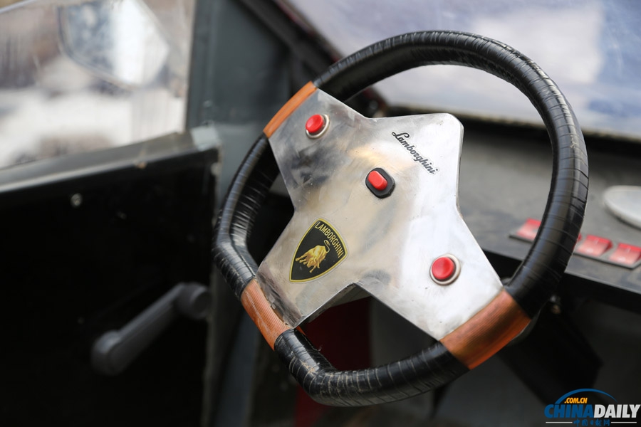 方向盤中部按鈕控制車子的前進(jìn)、倒車。方向盤上的蘭博基尼標(biāo)志是老郭在網(wǎng)上購買的。(侯建勛 攝)