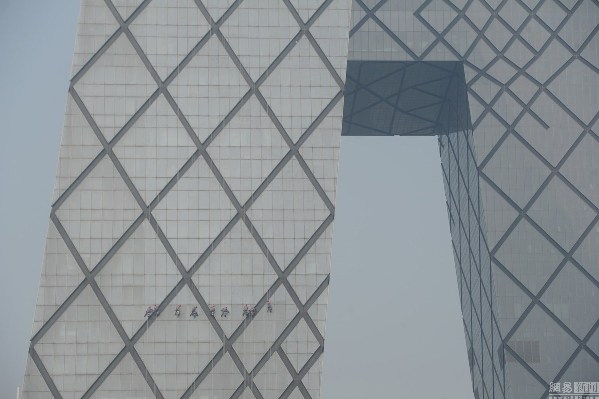 2015年4月9日消息,北京,近日有央視記者發(fā)微信說,央視新址大樓正在開始建成以來的首次外里面清洗,清洗費用50萬元人民幣,耗時需要40天。圖為在央視大樓的外吊……