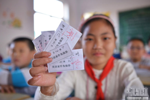 2013年10月16日,江蘇鎮(zhèn)江新區(qū)實(shí)驗(yàn)小學(xué)五年級(4)班的唐玥在展示她獲得的五張“作業(yè)免做券”。封疆江 攝 圖片來源:東方IC 版權(quán)作品 請勿轉(zhuǎn)載10月16日,江蘇鎮(zhèn)……