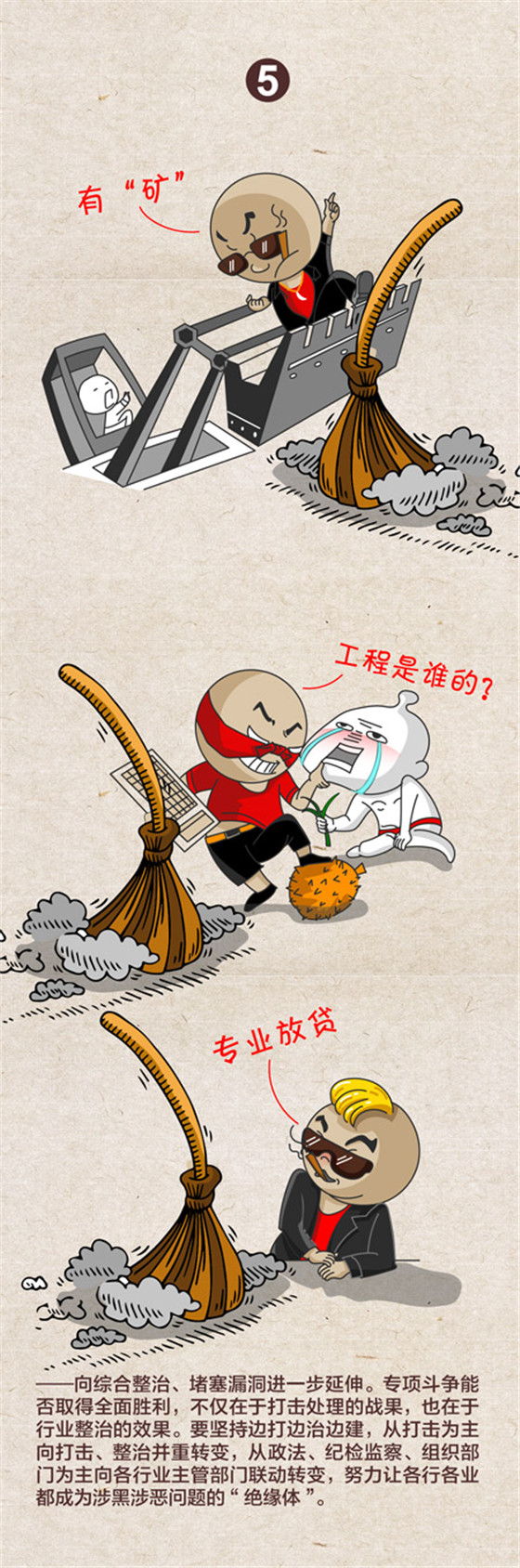 中央紀(jì)委國(guó)家監(jiān)委網(wǎng)站近日發(fā)布一組題為《2019掃黑除惡“六個(gè)延伸”》的漫畫(huà),對(duì)2019年掃黑除惡專(zhuān)項(xiàng)斗爭(zhēng)提出向偵破大案、打財(cái)斷血進(jìn)一步延伸,向網(wǎng)絡(luò)空間、新興領(lǐng)域進(jìn)一步延伸,向深挖幕后、打傘破網(wǎng)進(jìn)一步延伸,向依法懲治、快訴快判進(jìn)一步延伸,向綜合整治、堵塞漏洞進(jìn)一步延伸,向固本強(qiáng)基、鏟除土壤進(jìn)一步延伸等六大方向。