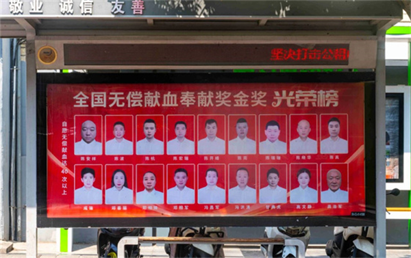 在第22個(gè)世界獻(xiàn)血者日到來(lái)之際,安康市中心血站精心策劃,自6月中旬起,在位于市政務(wù)大廳、市中心醫(yī)院、市中心醫(yī)院北院區(qū)門前的三處公交候車亭,以及中心城區(qū)兩處LED大屏上,全天循環(huán)展播著安康市榮獲“全國(guó)無(wú)償獻(xiàn)血奉獻(xiàn)獎(jiǎng)”終身榮譽(yù)獎(jiǎng)、金獎(jiǎng)、銀獎(jiǎng)、銅獎(jiǎng)的獲獎(jiǎng)?wù)叽盹L(fēng)采照片。