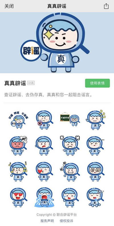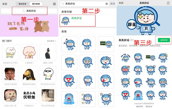 微信表情商店搜索“真真辟謠”,進(jìn)入表情專(zhuān)輯,點(diǎn)擊“使用表情”,即可使用。