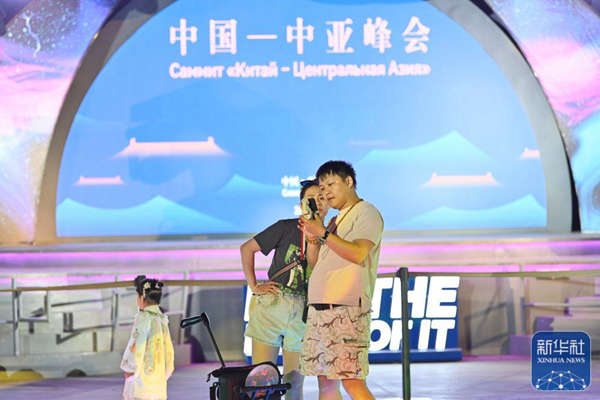 ↑5月15日,在西安大唐不夜城一處中國-中亞峰會(huì)活動(dòng)展演舞臺(tái)前,來自山西的游客回看拍攝的視頻。新華社記者 宋為偉 攝
