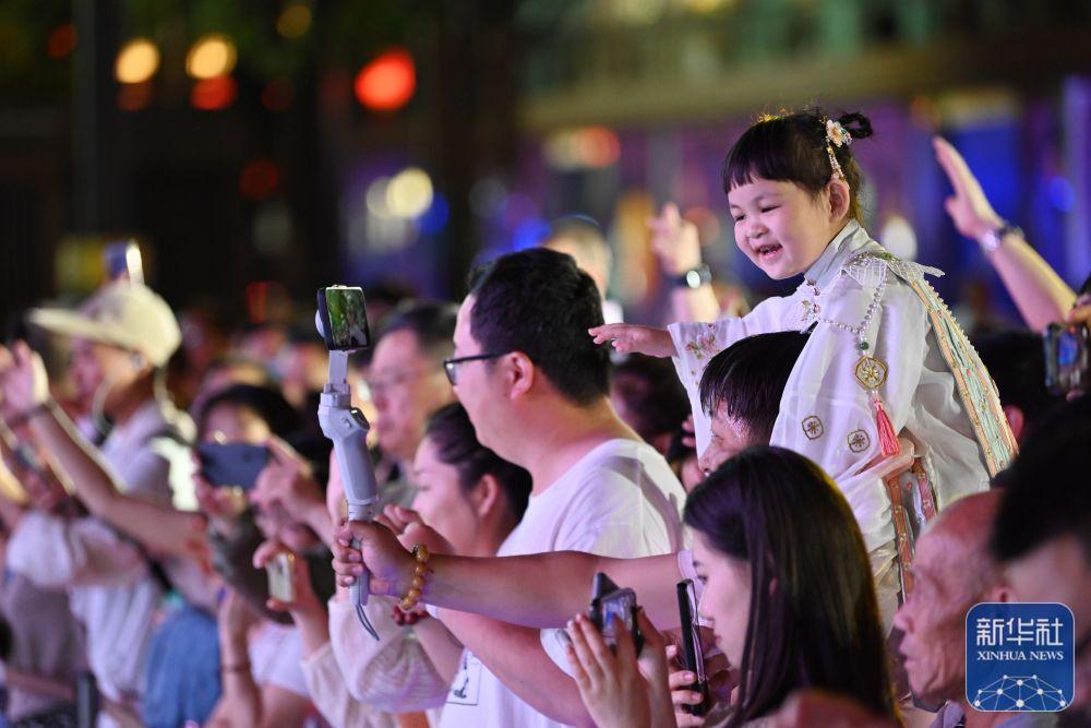 ↑5月15日,在西安大唐不夜城,身著古裝的小朋友騎在父親的肩上參與互動(dòng)演出。新華社記者 宋為偉 攝