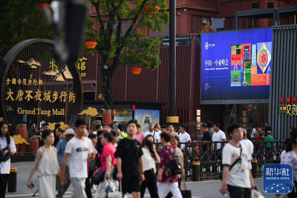 ↑這是5月15日拍攝的西安市雁塔區(qū)一處商場外的中國-中亞峰會(huì)宣傳海報(bào)。新華社記者 張博文 攝