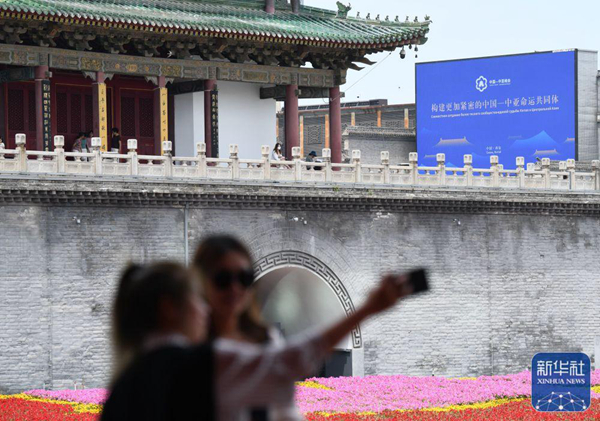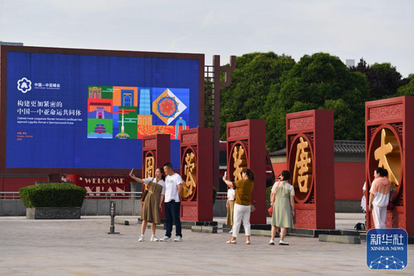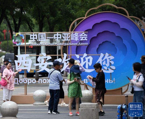 ↑5月16日,游客在西安市北大街上與中國-中亞峰會(huì)主題裝置合影。新華社記者 李一博 攝