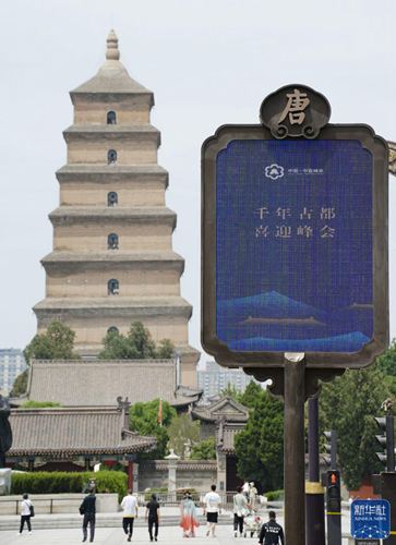 ↑西安大雁塔周邊展示的電子廣告牌(5月16日攝)。新華社記者 邵瑞 攝