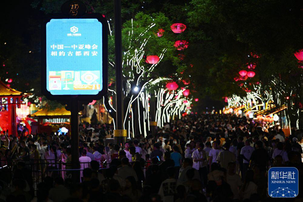 ↑5月15日,游客在西安大唐不夜城游覽。新華社記者 宋為偉 攝