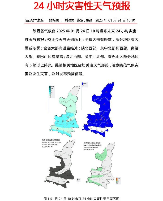 陜西省氣象臺2025年01月24日10時發(fā)布未來24小時災(zāi)害性天氣預(yù)報: