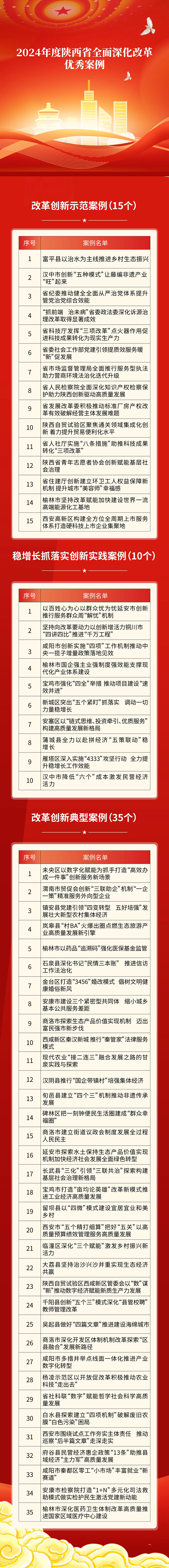2024年度陜西省全面深化改革優(yōu)秀案例中,改革創(chuàng)新示范案例15個(gè),包括富平縣以治水為主線推進(jìn)鄉(xiāng)村生態(tài)振興等案例;穩(wěn)增長抓落實(shí)創(chuàng)新實(shí)踐案例10個(gè),包括以百姓心為心以群眾憂為憂延安市創(chuàng)新推行服務(wù)群眾周“解憂”機(jī)制、堅(jiān)持向改革要?jiǎng)恿σ詣?chuàng)新增活力銅川市“四講四比”推進(jìn)“千萬工程”、咸陽市創(chuàng)新實(shí)施“四項(xiàng)”工作機(jī)制推動(dòng)中央一攬子增量政策落地見效等案例;改革創(chuàng)新典型案例35個(gè),包括未央?yún)^(qū)以數(shù)字化賦能為抓手打造“高效辦成一件事”創(chuàng)新服務(wù)新場景、渭南市貿(mào)促會(huì)創(chuàng)新“三聯(lián)助企”機(jī)制“一企一策”精準(zhǔn)服務(wù)外向型企業(yè)、鎮(zhèn)安縣黨建引領(lǐng)“四變轉(zhuǎn)型 五好培強(qiáng)”發(fā)展壯大新型農(nóng)村集體經(jīng)濟(jì)等案例。