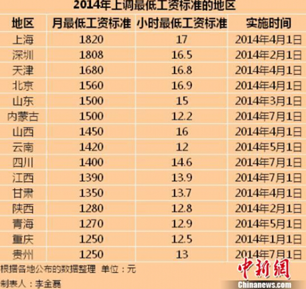 15地公布2014年最低工資標(biāo)準(zhǔn) 陜西1280排倒數(shù)第四