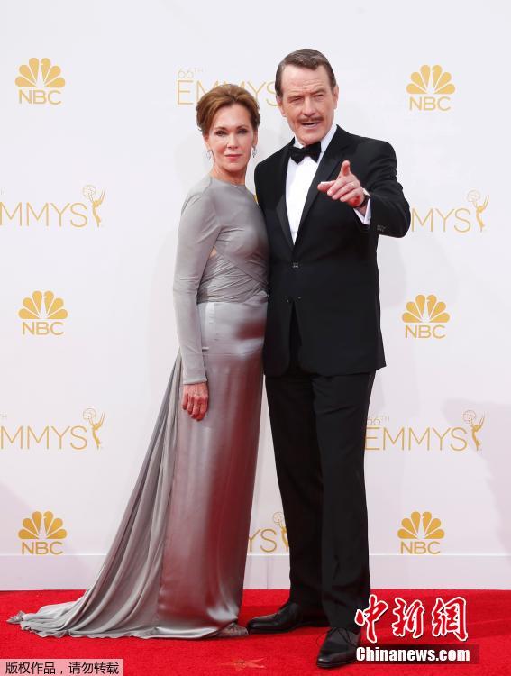 當(dāng)?shù)貢r間2014年8月25日,美國洛杉磯,第66屆美國電視艾美獎頒獎典禮舉行,眾星走上紅毯。圖為《絕命毒師》男星布萊恩科蘭斯頓攜妻亮相v6G安康新聞網(wǎng)