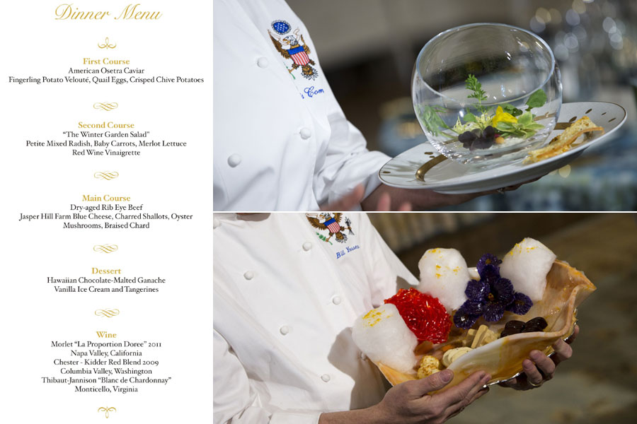 此次宴會在白宮花園舉行,共有4道菜肴。第一道菜是來自美國伊利諾伊州河口的奧西特拉魚子醬,配上來自賓夕法尼亞州的鵪鶉蛋,以及來自紐約州、愛達(dá)荷州以及加州農(nóng)場的數(shù)十種馬鈴薯。