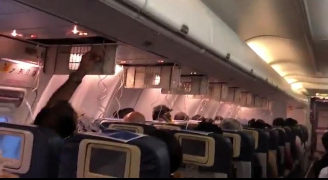 失壓機(jī)艙氧氣面罩掉落 乘客紛紛戴上面罩。 圖片來(lái)源:乘客自拍。