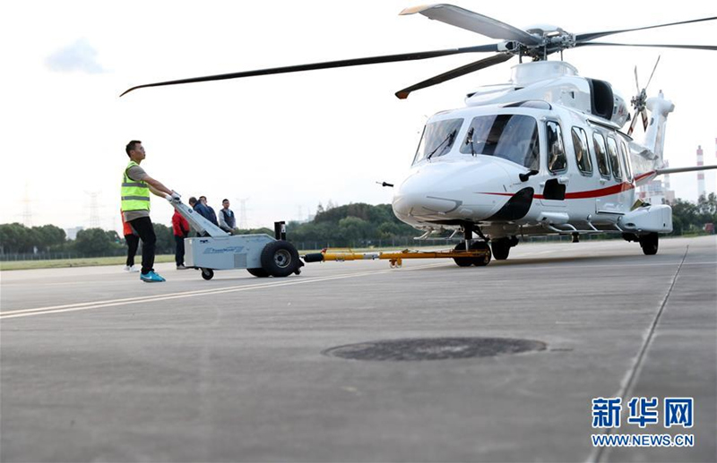 10月20日,參加進(jìn)博會(huì)展出的意大利萊奧納多直升機(jī)公司AW189型直升機(jī)降落在上海高東直升機(jī)常新華社記者 方喆 攝