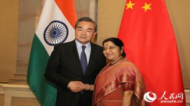 6月4日,國務(wù)委員兼外交部長王毅在南非出席金磚國家外長正式會(huì)晤期間會(huì)見印度外長斯瓦拉杰。 李志偉攝 人民網(wǎng)比勒陀利亞6月4日電 (記者李志偉……