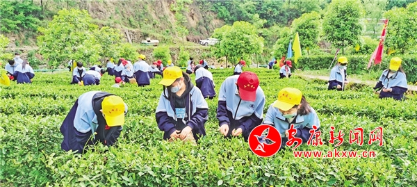白河縣中廠初級中學學生在茅坪鎮(zhèn)五峰生態(tài)茶園采茶研學。 羅偉 攝