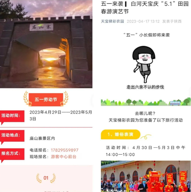 景區(qū)景點開放到位。“五一”期間,3家A級景區(qū)景點全部正常開放。其中天寶4A景區(qū)從4月29日至5月3日籌備舉辦田園春游演藝節(jié)系列活動,推出門票七折優(yōu)惠措施;廟山寨3A景區(qū)將舉辦“廟山”好聲音、攀巖比賽等節(jié)慶活動,推出138元游玩通票打五折、門票+餐飲立減等優(yōu)惠措施。