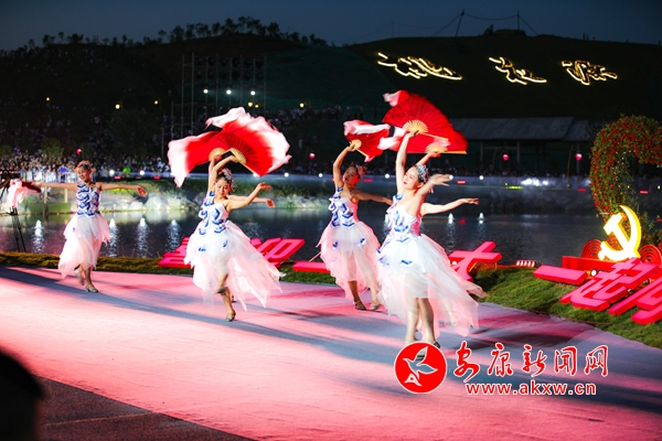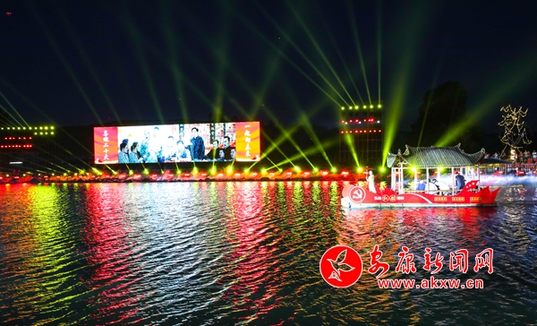 晚會在嘹亮激昂的獨唱《東方紅》中拉開序幕,緊接著,磅礴大氣的歌舞串燒《我和我的祖國》《萬疆》《愛我中華》,如詩如畫的水上表演《南湖紅船》《江南水鄉(xiāng)》《滾滾長江東逝水》,動力澎湃的RAP時尚秀《門戶新安康》,美輪美奐歌舞表演《我的深情為你守候》《為祖國干杯》《送你一個長安》《我愛你,中國》《領(lǐng)航》等節(jié)目相繼登臺表演,與此同時,絢麗多彩的燈光秀和仙氣飄飄的霧森特效穿插其中,不斷將演出推向高潮。最后,整場演出在大合唱《沒有共產(chǎn)黨就沒有新中國》的歌聲中圓滿落下帷幕。