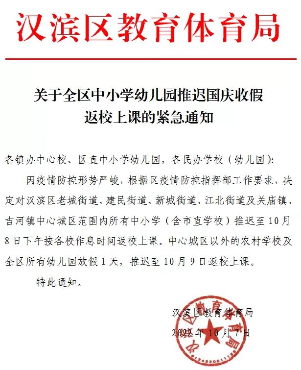 本網(wǎng)訊 漢濱區(qū)教育體育局發(fā)布緊急通知,因疫情防控形勢嚴峻,根據(jù)區(qū)疫情防控指揮部工作要求,決定對漢濱區(qū)老城街道、建民街道、新城街道、江北街道及關(guān)廟鎮(zhèn)、吉河鎮(zhèn)中心城區(qū)范圍內(nèi)所有中小學(xué)(含市直學(xué)校)推遲至10月8日下午按各校作息時間返校上課。中心城區(qū)以外的農(nóng)村學(xué)校及全區(qū)所有幼兒園放假1天,推遲至10月9日返校上課。C9H安康新聞網(wǎng)