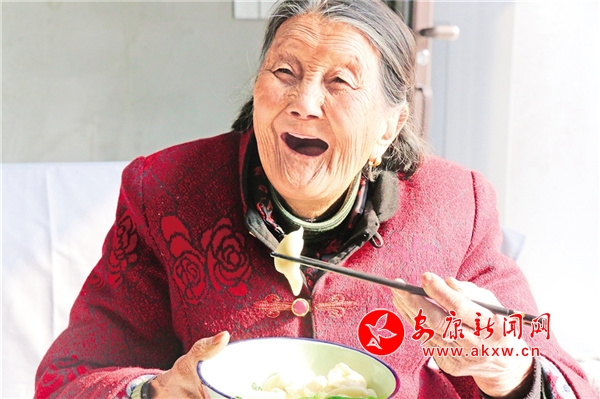 李增富前腳剛進門,我們也隨著他走進屋,接過兒子遞過來的飯碗,母親一口一口慢慢吃著餃子,“這餃子香,我一次能吃十幾個呢。”雖然耳朵聽不清,但是老人對食堂的飯菜贊賞有加。