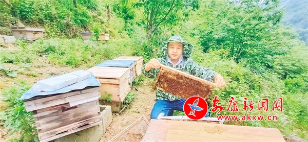 2016年,江鑫養(yǎng)了3箱蜜蜂,但由于經(jīng)驗(yàn)不足,3箱蜜蜂飛跑了2箱,于是江鑫就按照河南夫妻的經(jīng)驗(yàn)細(xì)心養(yǎng)殖,小心呵護(hù),2017年由1箱蜜蜂繁殖發(fā)展到50多箱蜜蜂,在黃泥村“兩委”的支持下他還成立了養(yǎng)蜂合作社。2018年,又繁殖發(fā)展40箱蜜蜂,在漢濱區(qū)文化和旅游廣電局的幫扶指導(dǎo)下,江鑫同時(shí)享受了漢濱區(qū)扶貧政策的獎(jiǎng)勵(lì)扶持資金8000元,當(dāng)年賣(mài)出蜂蜜200多公斤,價(jià)格200元一公斤;2019年又發(fā)展200多箱蜜蜂,當(dāng)年賣(mài)出了500多公斤蜂蜜,收入10多萬(wàn)元,他自己也成了養(yǎng)蜂“土專(zhuān)家”,很多當(dāng)?shù)乩习傩障蛩麑W(xué)習(xí)養(yǎng)蜜蜂的技術(shù),他毫不保留地傳授養(yǎng)蜂技術(shù),還給他們提供中華蜂種、蜂箱,幫助他們?cè)诰W(wǎng)上銷(xiāo)售蜂蜜。目前,江鑫已經(jīng)帶動(dòng)30多戶群眾一起發(fā)展“甜蜜”事業(yè)。