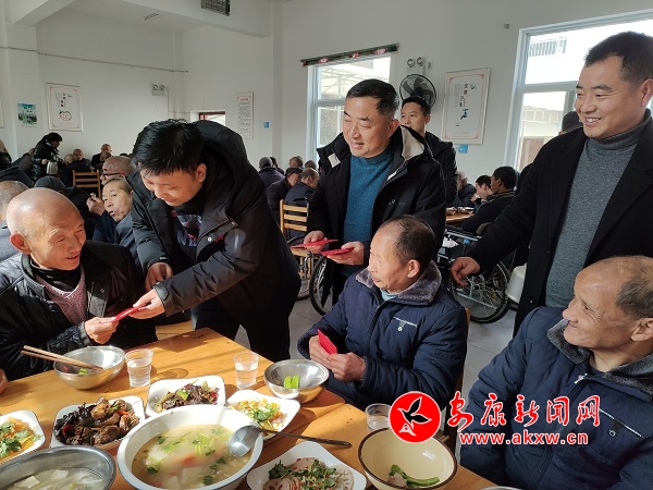 中午11點,“客人”準時而至。“大家新年好!給大家拜年了!一會兒咱們一起吃團年飯!”早陽鎮(zhèn)黨委書記金鑫和副鎮(zhèn)長陳志恒剛走進敬老院,就熱情地揮著手和老人們打著招呼。走進敬老院的餐廳,一股濃濃的香味撲面而來,十張桌子上早已整齊地擺放著豐盛的菜肴,紅苕蒸肉、紅燜肘子、紅燒雞塊、八寶飯、涼拌菠菜……紅的綠的擺滿整張桌子,讓人賞心悅目。