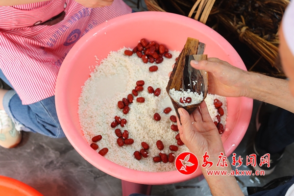 伴隨著一陣濃濃的糯米香撲鼻而來,只見馬峰亮將筍殼粽葉疊放,彎成圓錐狀,抓起一撮泡好的糯米,填入本地紅豆沙,粽葉彎折捆扎后,一個(gè)有棱有角安康傳統(tǒng)豆沙粽就完成了。蒸煮兩個(gè)半小時(shí),剛出鍋的安康傳統(tǒng)手工粽,冒著騰騰的熱氣,剝開粽葉,一口下去,軟糯香甜、筋道拉絲,回味無窮。