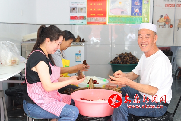 現(xiàn)下正是粽子產(chǎn)銷旺季,而彈牙清香的傳統(tǒng)手工粽最有兒時(shí)的端午味,更受消費(fèi)者追捧。在漢濱區(qū)五星街的“粽老頭”非遺工坊內(nèi),“粽老頭”粽子制作技藝非遺傳承人馬峰亮正和工人們一起,趕制粽子訂單。