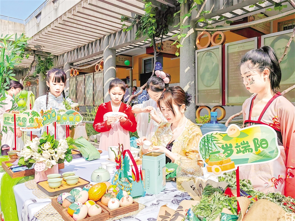 活動(dòng)中,學(xué)校精心布展了端午傳統(tǒng)習(xí)俗和端午文化活動(dòng)體驗(yàn)區(qū),小小講解員身著傳統(tǒng)服飾,為師生講解端午節(jié)的來(lái)歷、傳統(tǒng)習(xí)俗以及粽子的制作方法,還通過(guò)射五毒、投壺、套圈等傳統(tǒng)游戲,讓同學(xué)們深入了解端午文化內(nèi)涵與魅力。此外,學(xué)校邀請(qǐng)漢濱區(qū)中醫(yī)醫(yī)院的醫(yī)師走進(jìn)校園,為師生們講授中醫(yī)藥文化,制作傳統(tǒng)中藥香囊,在實(shí)踐中感受中醫(yī)藥文化魅力。