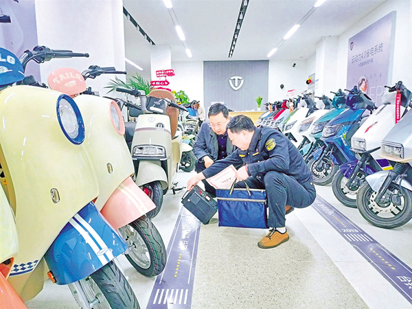 ①執(zhí)法人員檢查電動自行車配件。席瑾 攝②向電動自行車銷售人員了解情況。席瑾 攝本網訊(通訊員 柯賢會 喬巍)“請出示電動自行車合格證件!薄按蜷_蓋板,看看……